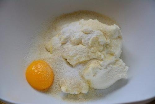 1. для начала нужно приготовить кокосовые шарики. В чашке мы смешиваем творог, сахар, ванилин, манку и яичный желток.